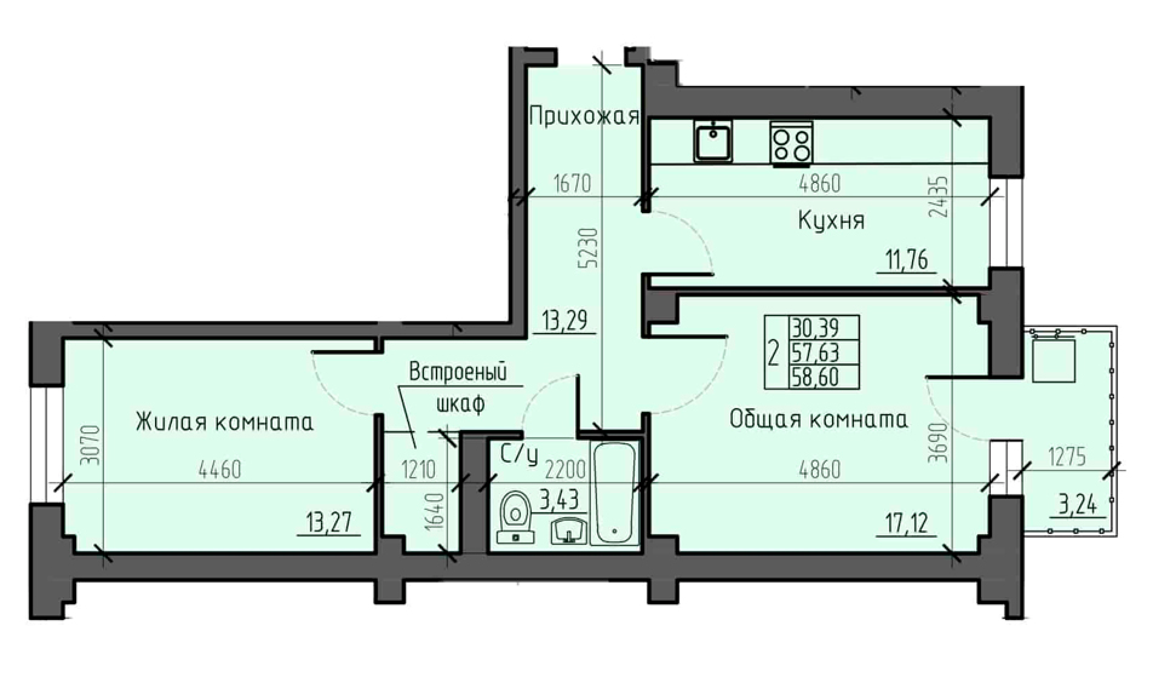 Площадь: 58,6 кв.м.