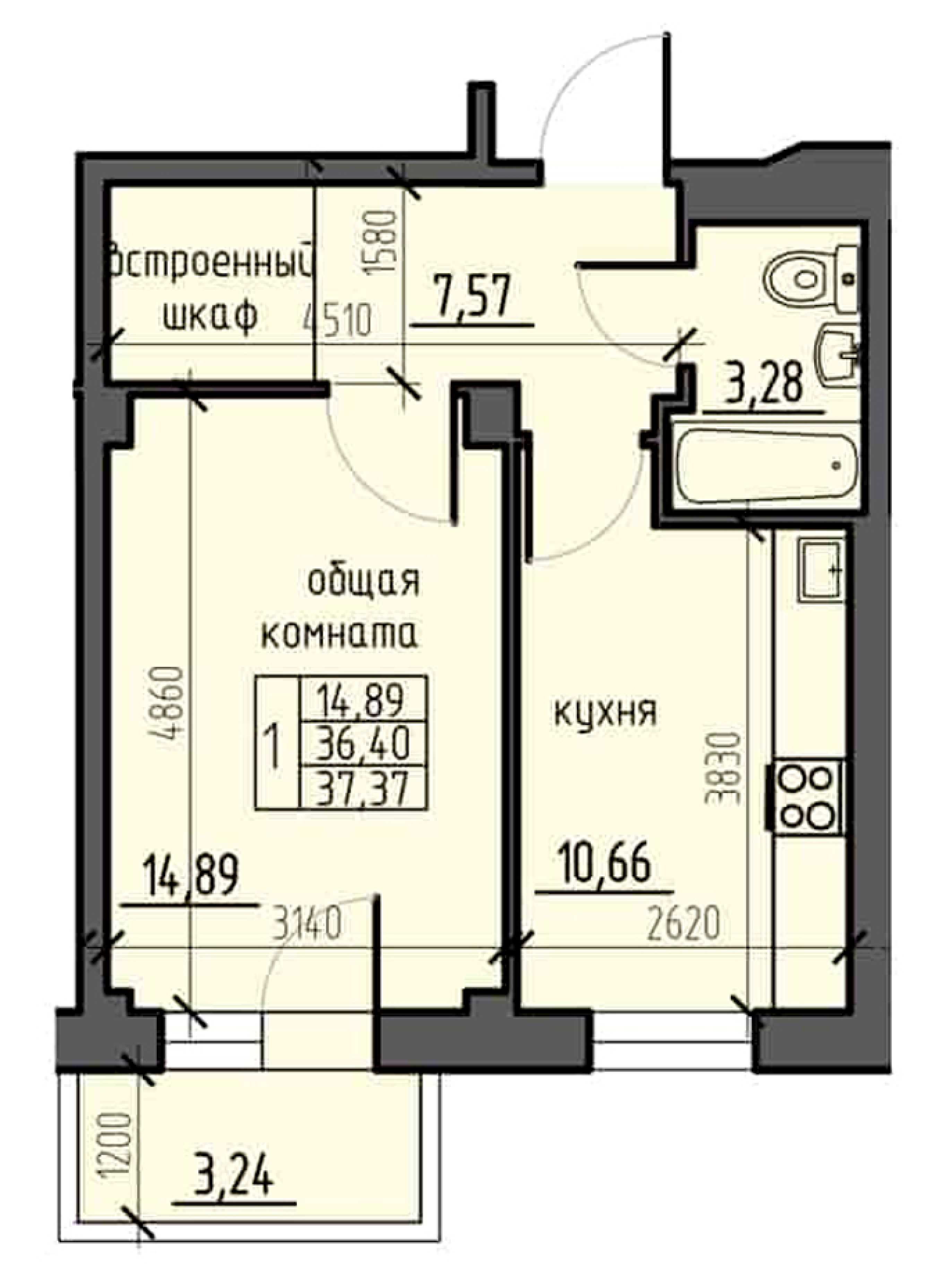 Площадь: 37,37 кв.м.