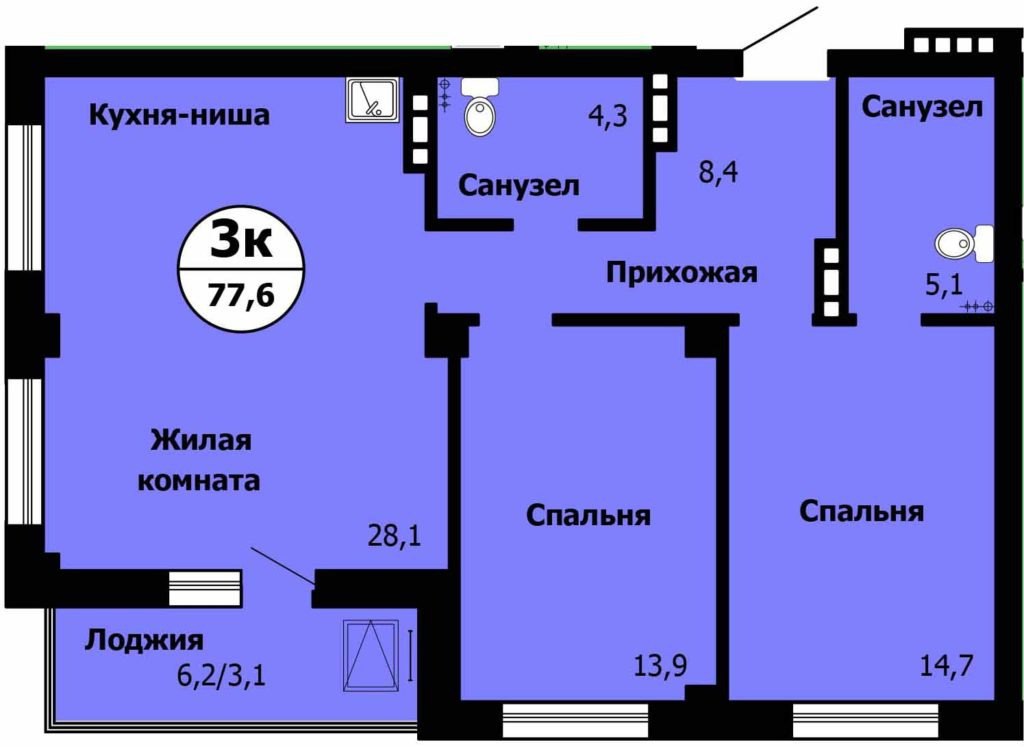 Площадь: 77,6 кв.м.